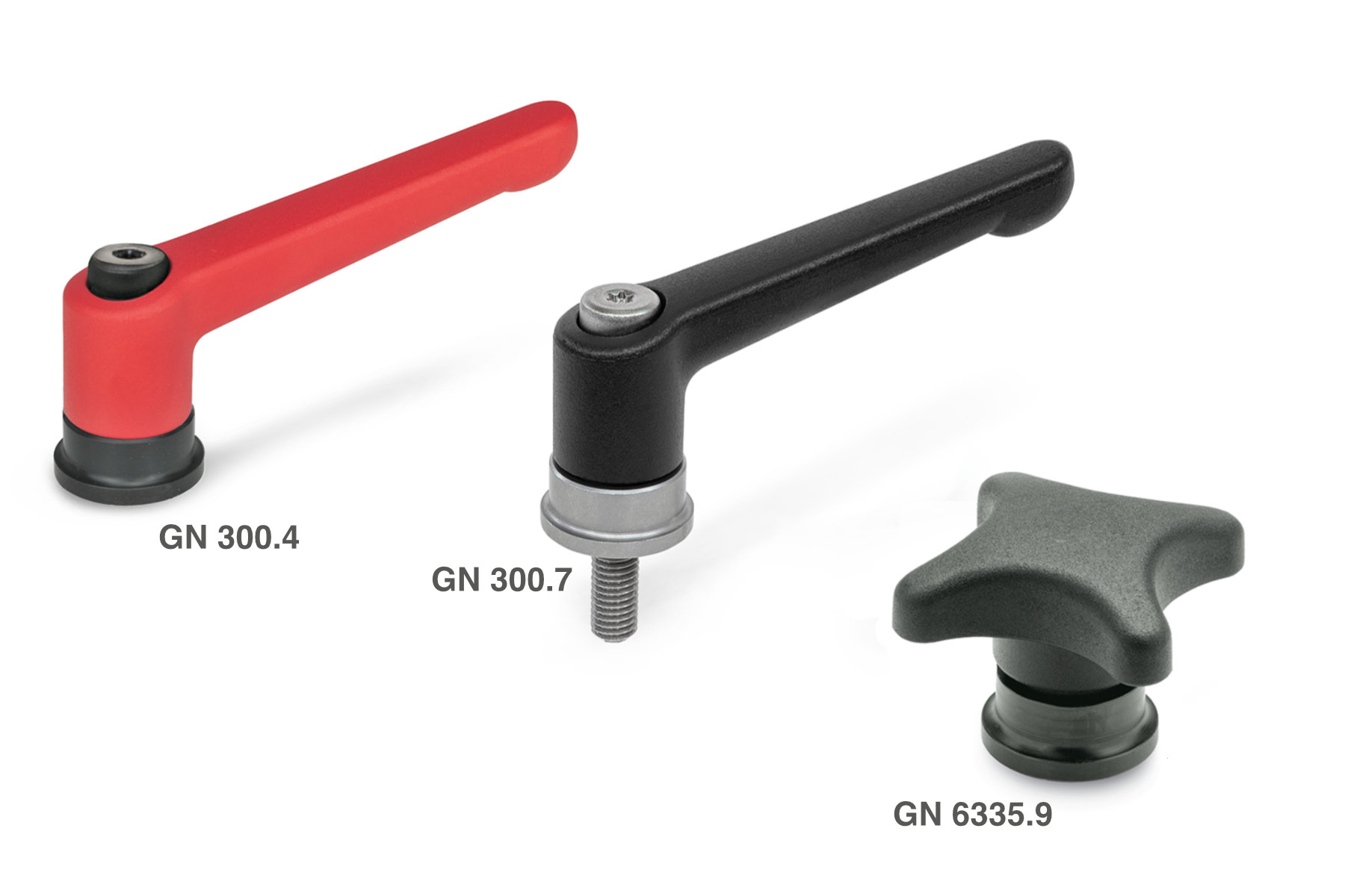Podesive zatezne ručice sa pojačanom zateznom silom GN 300.4 se standardno isporučuju sa unutrašnjim ili spoljnim navojem. Ozubljenje sa finim zupcima iznutra omogućava korisnicima da odaberu najbolju poziciju za hvatanje. Ručke poluge od livenog cinka su ili hromirane ili obložene plastikom u pet različitih boja. Aksijalni ležaj i ostatak mehanizma ispod su izrađeni od nitriranog odnosno bruniranog čelika. Ako je za upotrebu potrebna zaštita od korozije, odgovara isto tako izvedena verzija GN 300.7, kod koje su podešavajuća, zavrtna i ležajna jedinica u potpunosti izrađene od nerđajućeg čelika.