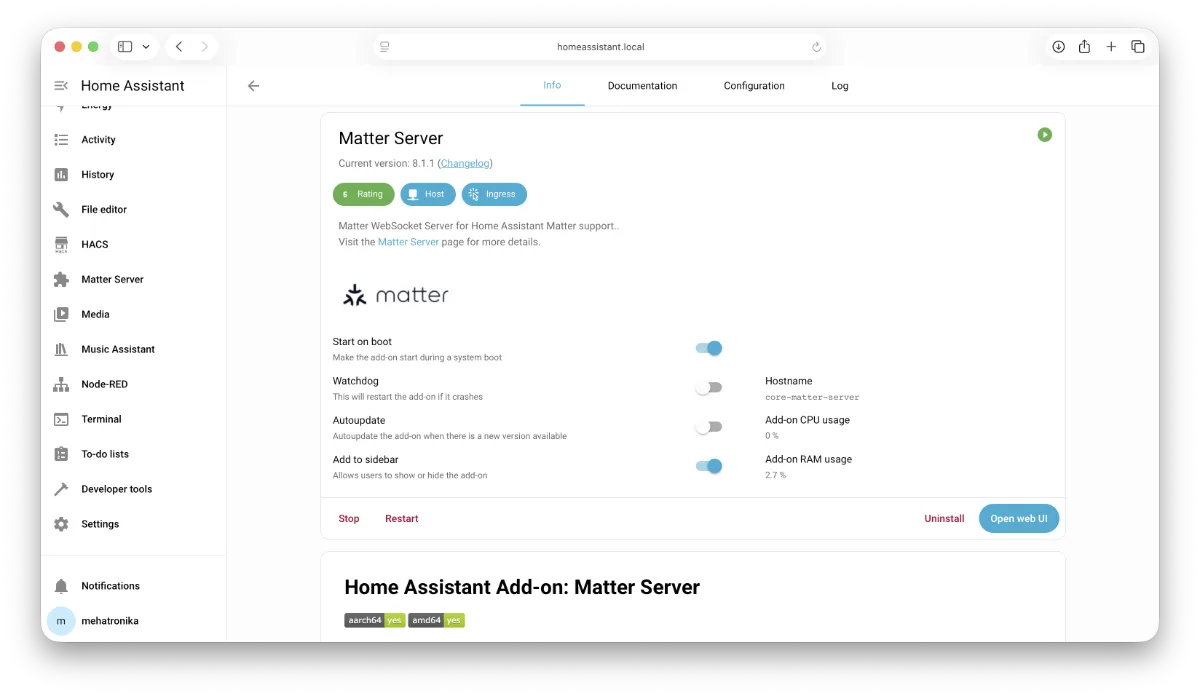 Za Matter je potrebno instalirati Matter Server add-on koji omogućava Home Assistant Yellow-u da upravlja svim Matter uređajima u mreži. Matter je komunikacioni standard za smart home i IoT uređaje, a za komunikaciju može koristiti lokalnu LAN mrežu, bilo Ethernet ili Wi-Fi, a posebno je interesantno zbog male potrošnje kada se realizuje preko Thread protokola. Thread formira mash mrežu, slično Zigbee-u. Glavna razlika je što su Thread uređaji IP adresabilni. Zigbee uređaji moraju imati gateway ukoliko je potrebno da im se pristupa (ili da oni pristupaju) sa interneta. Bitno je znati da svi Thread uređaji ne koriste Matter, već mogu koristiti i neki prilagođeni komunikacioni standard, kao što to čini recimo Apple HomeKit. U nekim slučajevima zamenom firmvera takav uređaj se može integrisati u Matter over Thread uređaj.