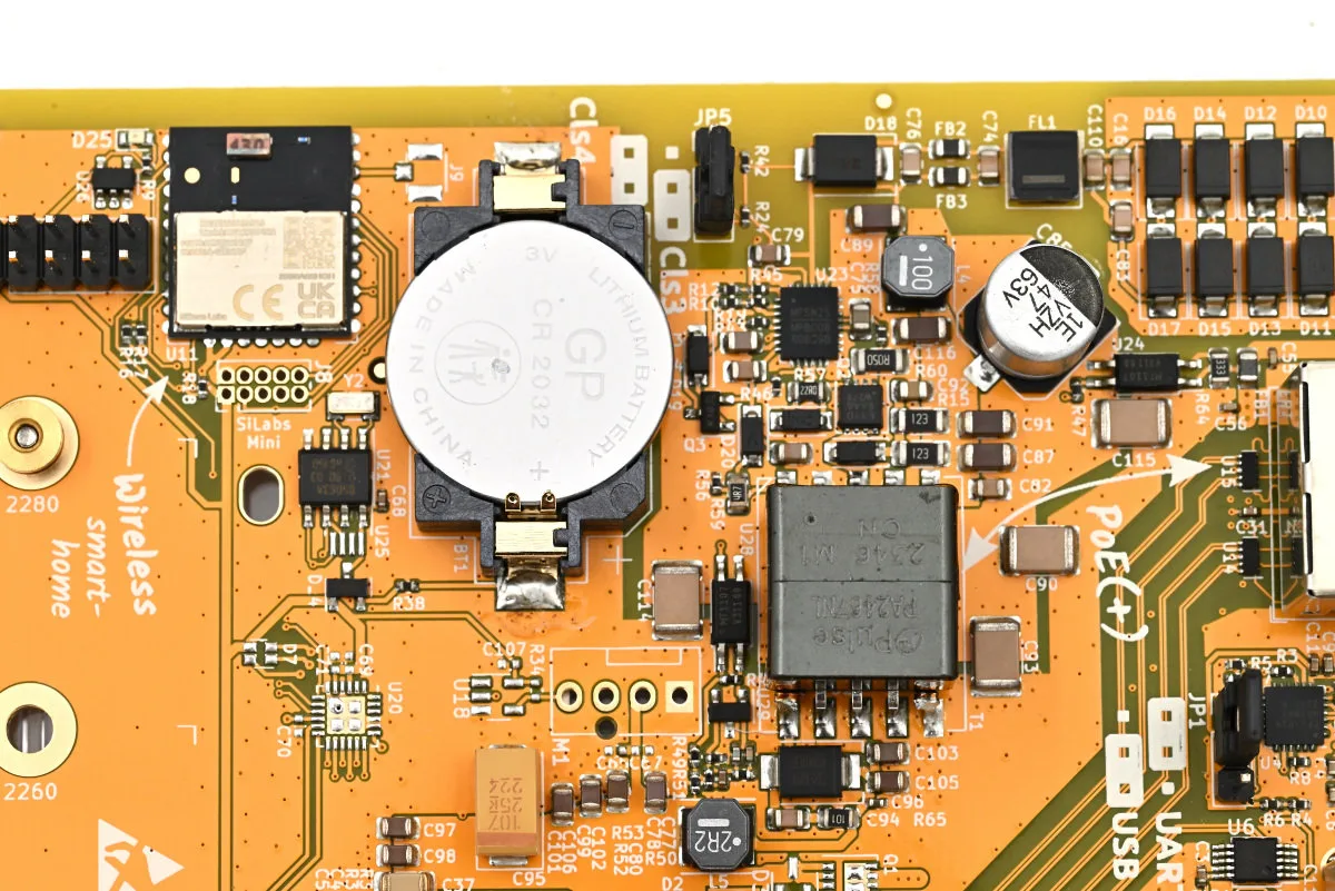 Uklonimo li poklopac, vidimo da se na ploči nalazi napojni blok koji je zajednički za ovaj ulaz i PoE ulaz. Tu je i PoE transformator zbog 48 V koji se prenosi preko Ethernet kabla. Vidimo iza i ležište za litijumsku CR2032 bateriju za napajanje RTC-a, što može biti korisno za očuvanje stanja u slučajevima prekida napajanja i na lokacijama gde nemamo pristup spoljnem internetu, pa time i nekom od vremenskih servera.