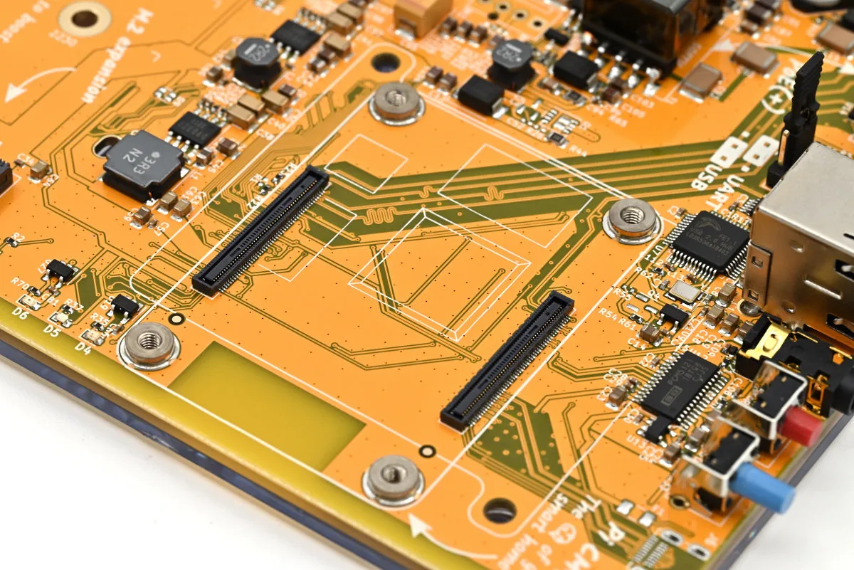 Ploča je izrađena da se na nju postavi Raspberry Pi Compute Module 4, čak su i položaju velikih čipova na modulu označeni na ploči kako bi pozicionirnje proteklo bez greške. Generalno nije ni moguće naopako utisnuti modul, ako se bar pazi da otvori za ugaone zavrtnje za fiksiranje budu na pravom mestu. Ukoliko montirate Compute Module 5, po Nabu Casa preporuci, nemojte koristiti, a kamoli uvrtati ugaone zavrtnje da ne bi oštetili modul.
