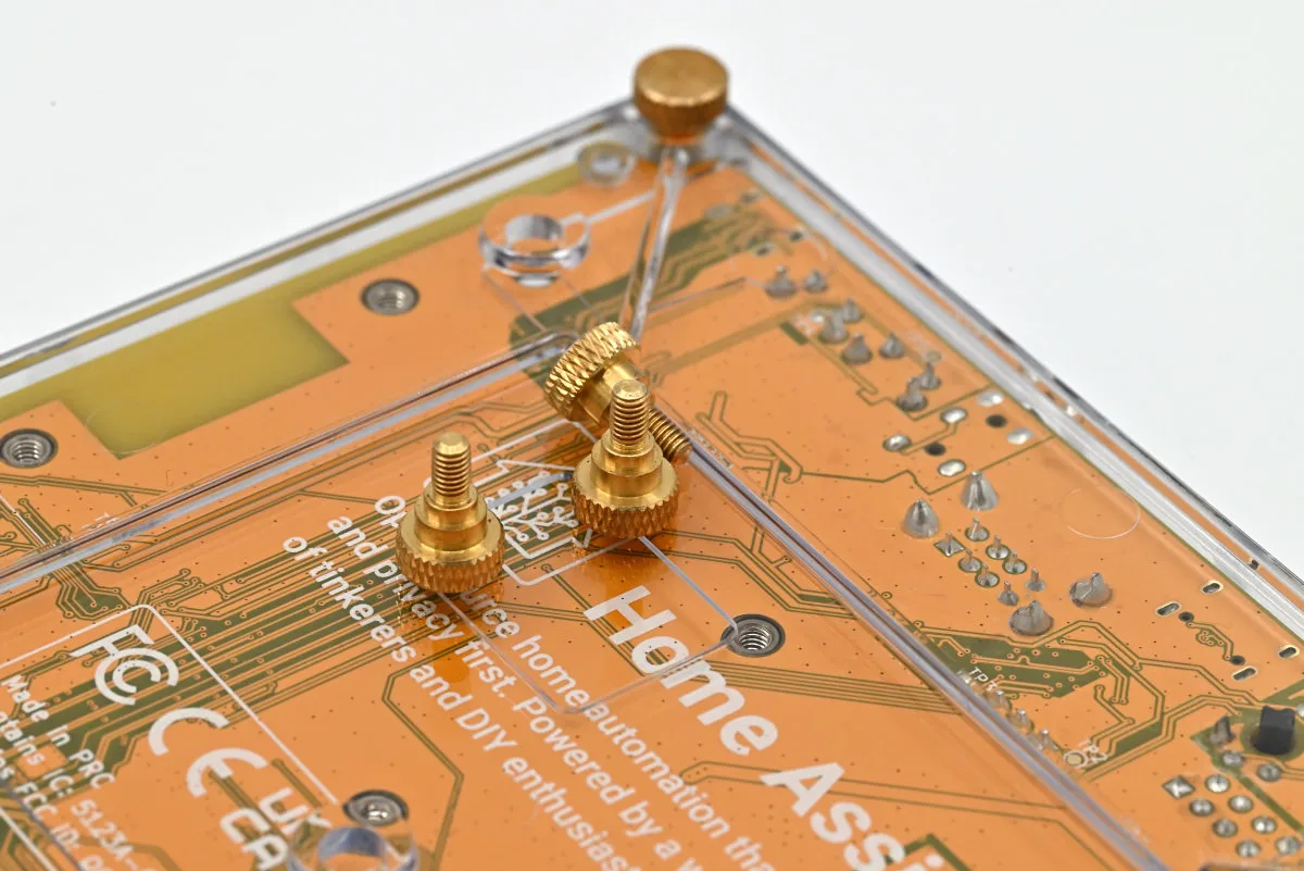 Čak je i osnova kućišta od plastike i montira se sa četiri mesingana zavrtnja koji su ujedno i nožice ovog modela. Napomena da je ovo proizvod u skladu sa postulatima zajednice otvorenog hardvera i softvera naštampana je i na ovoj ploči, koja je ipak više oker nego žute boje.