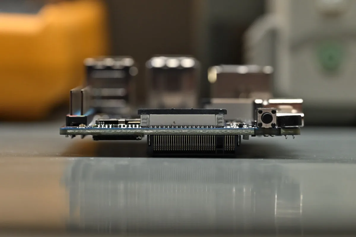 Uz samu ivicu ploče je mali mikrofon, pa reset dugme. Nakon ranije pomenutog USB-C porta je dvopinski konektor za zvučnik, pa HDMI konektor preko koga je moguće dobiti sliku maksimalne rezolucije 4K na 60 Hz. Do njega je MIPI CSI 2-lane ulaz za kameru. Na ploči sa donje strane postoji i drugi MIPI CSI 4-line ulaz za kameru. Nakon njega dolazi 3.5 mm stereo out/mono in audio konektor i najzad četiri pina za Poe HAT povezan sa Ethernet portom.