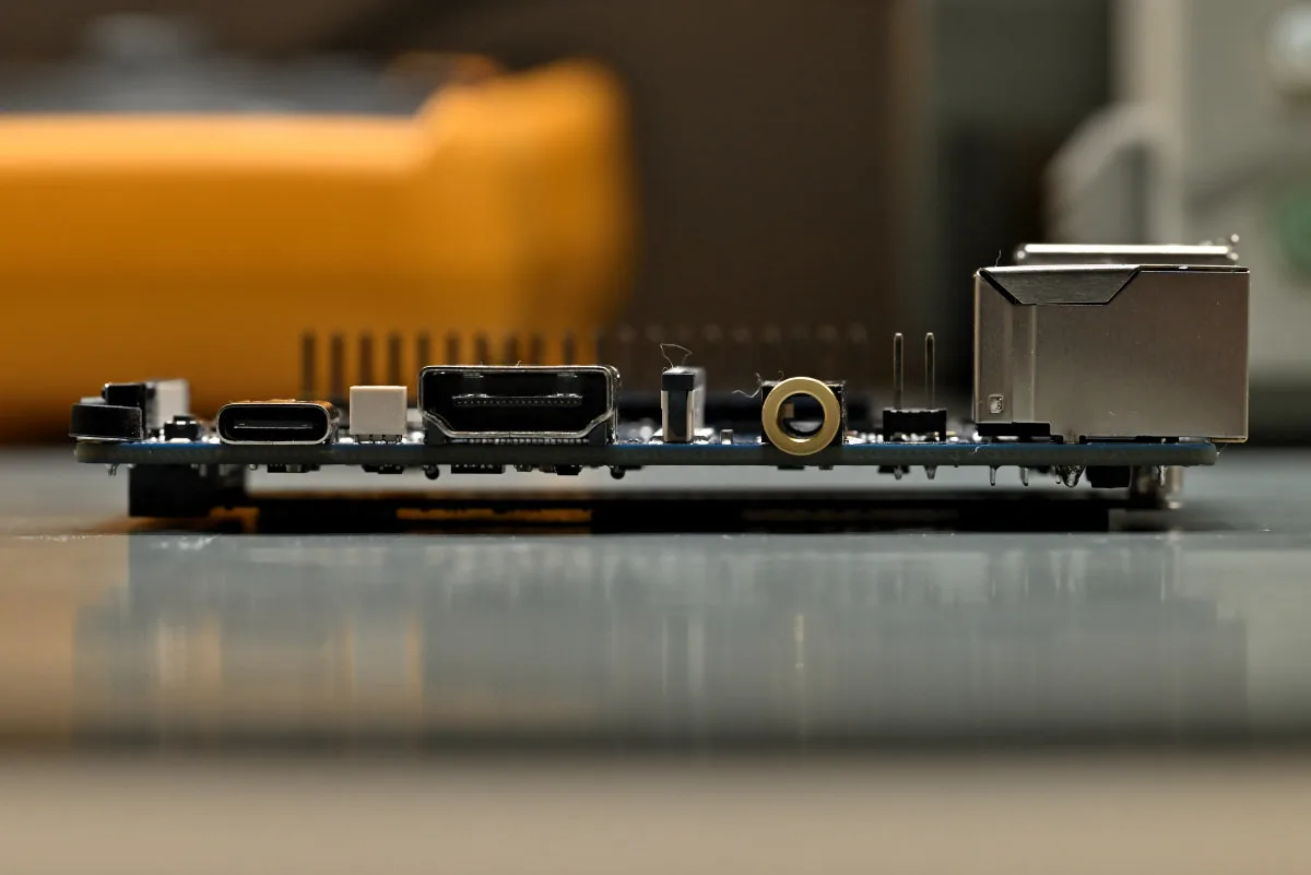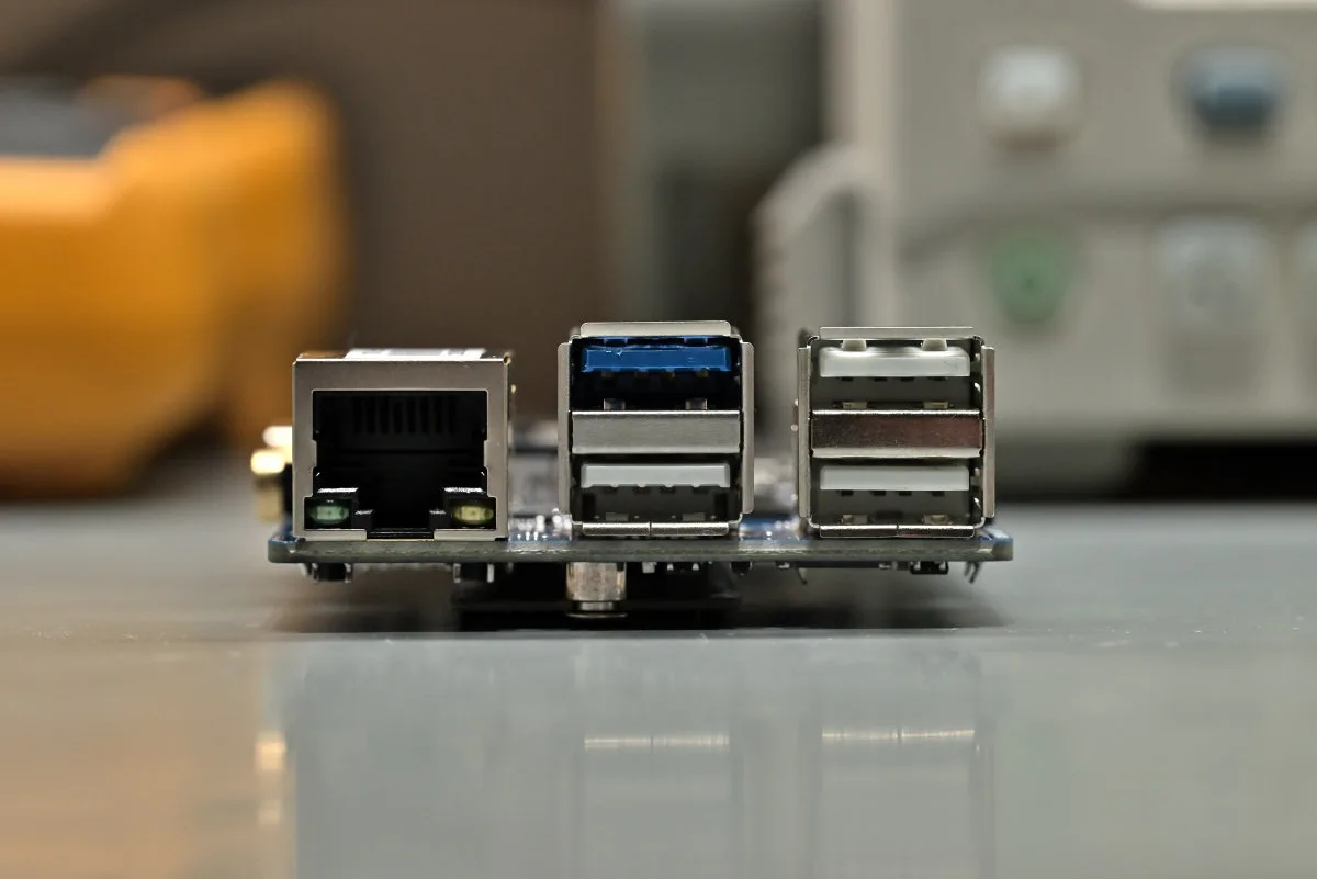 Ploča je u formatu Raspberry Pi Model A, sa malim varijacijama rasporeda i tipa portova – standard na koji smo navikli. Imamo četiri USB A porta, tri 2.0 i jedan 3.1 preko koga smo prenosili podatke brzinom 673 MB/s, što je veoma korektno. Za rad USB 2.0 portova zadužen je USB Hub Fe 1.1s, dok je USB 3.0 povezan direktno sa SoC-em.