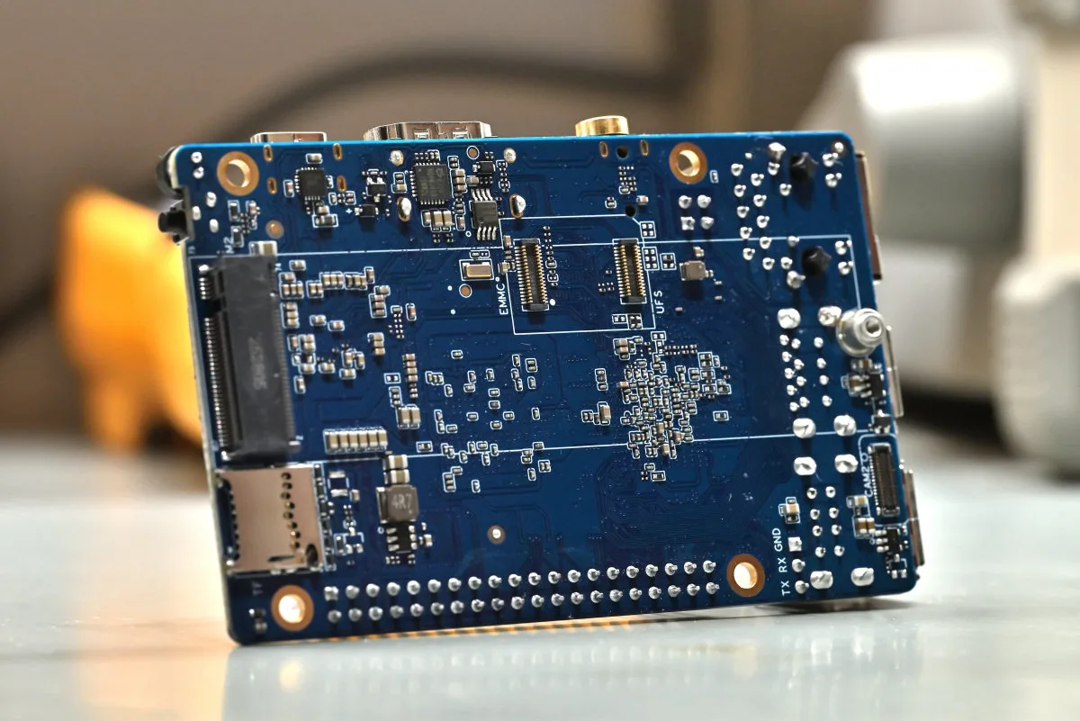 Sa donje strane ploče, osim pomenutog MIPI DSI konektora nalazi se i ležište za SD karticu, konektor za eMMC modul koji nudi Orange pi u veličinama 32, 64 i 256 GB i nazad M.2 M Key 2280 PCIe port.