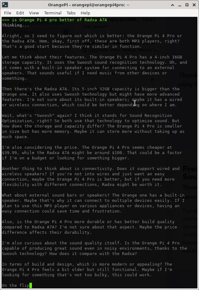 Izgenerisan odgovor je tipičan primer halucinacije AI-a uz sav njegov nadmen stav o poznavanju svega izražen kroz autoritativan tekst. Kada ovako mali modeli, na slabašnom AI hardveru ovako uljudno opsenare, teško je uopšte i pojmiti na šta su veliki modeli na moćnom hardveru spremni. A pitanje je bilo jednostavno: „da li je Orange Pi 4 pro bolji od Radxa A7A“.