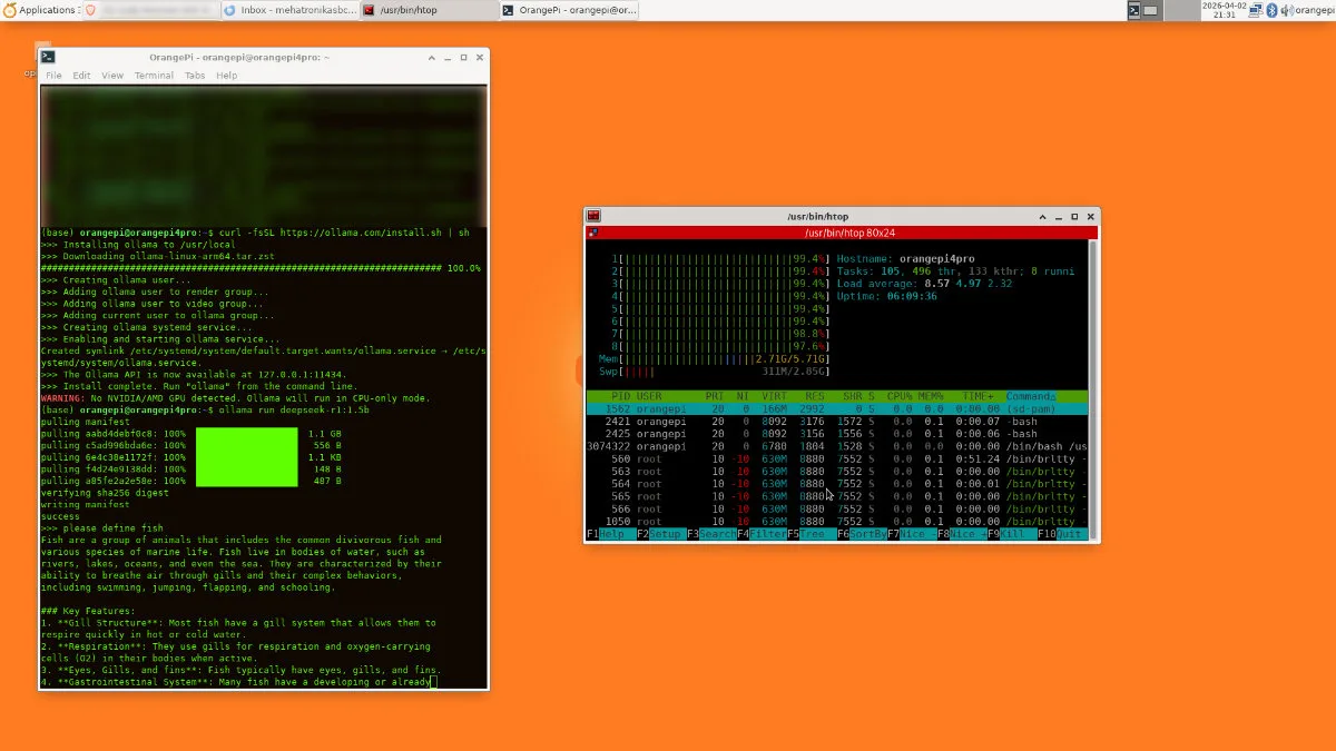 Isprobali smo i generativni AI, lokalni jezički model, doduše veoma majušan ollama 1.5b kome treba oko 3 GB memorije za rad, što je sa samim operativnim u graničnim mogućnostima ovog SBC-a. Pri radu, model aktivira sva jezgra na 100%, tako da u trenucima računar postaje potpuno. neresponzivan.