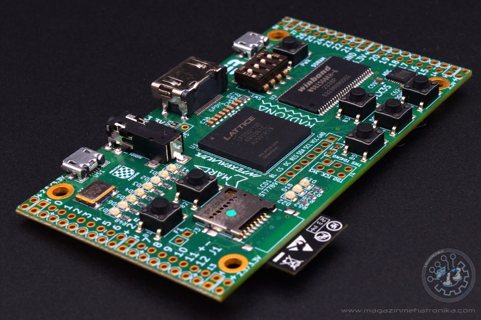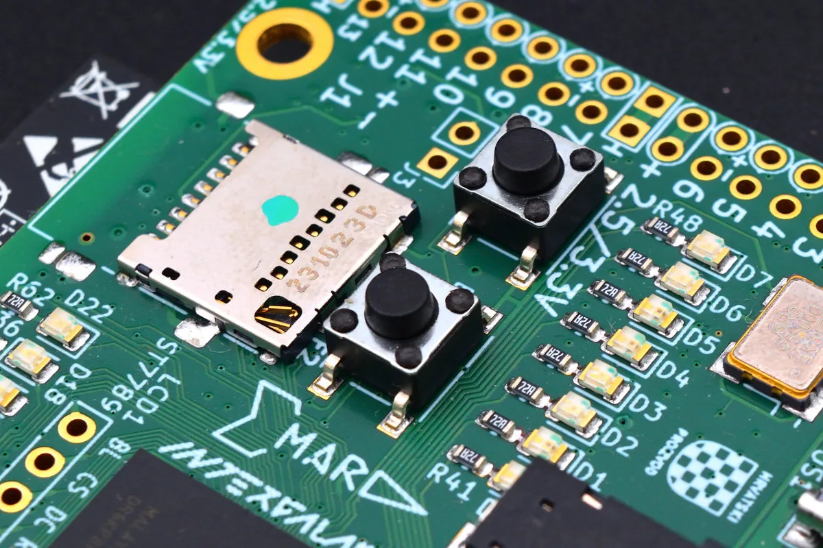 Odlično je što je na ploči realizovano i ležište za SD karticu, doduše u pitanju je malo neobičan preklopni model. Toliko neobičan da su i sami postavili kratak video o tome kako se kartica ubacuje i vadi iz njega. Desno od njega, na donjoj slici vidimo i red od osam (od D0 do D7) programabilnih RGB dioda. Dva dugmeta, označena sa B1 i B2, takođe vidljivi na slici su programabilna takođe i locirana su tu da bi u retro-gejming aplikacijama mogla zgodno da služe kao „fire“ dugmad.