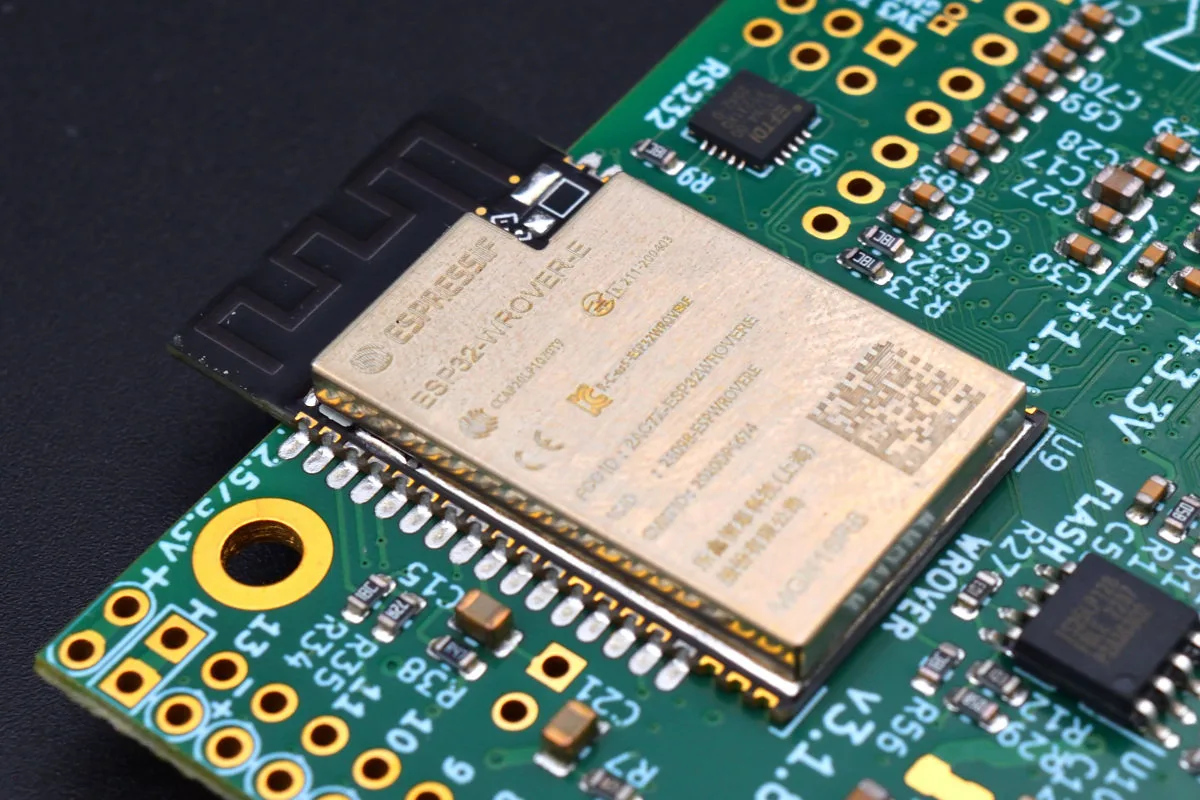 Za bežičnu povezivost, pa recimo i za daljinsko ažuriranje firmvera, zgodan je ugrađeni ESP32-WROVER-E. To je danas vremešni, ali provereno funkcionalan 2.4 GHz Wi-Fi i Bluetooth 4.2 BLE modul sa integrisanom antenom koji se jedno vreme primarno koristio kao rešenje za bežične komunikacije u mejkerskim projektima i displejima. Danas je sam Espressif otišao dalje sa manjim i tehnološki naprednijim modulima u svojim rešenjima za embedovane bežične komunikacije. Pazite na antenu, tako je postavljena da viri van gabarita ploče, a kako je tanana, vrlo ju je lako odvaliti.