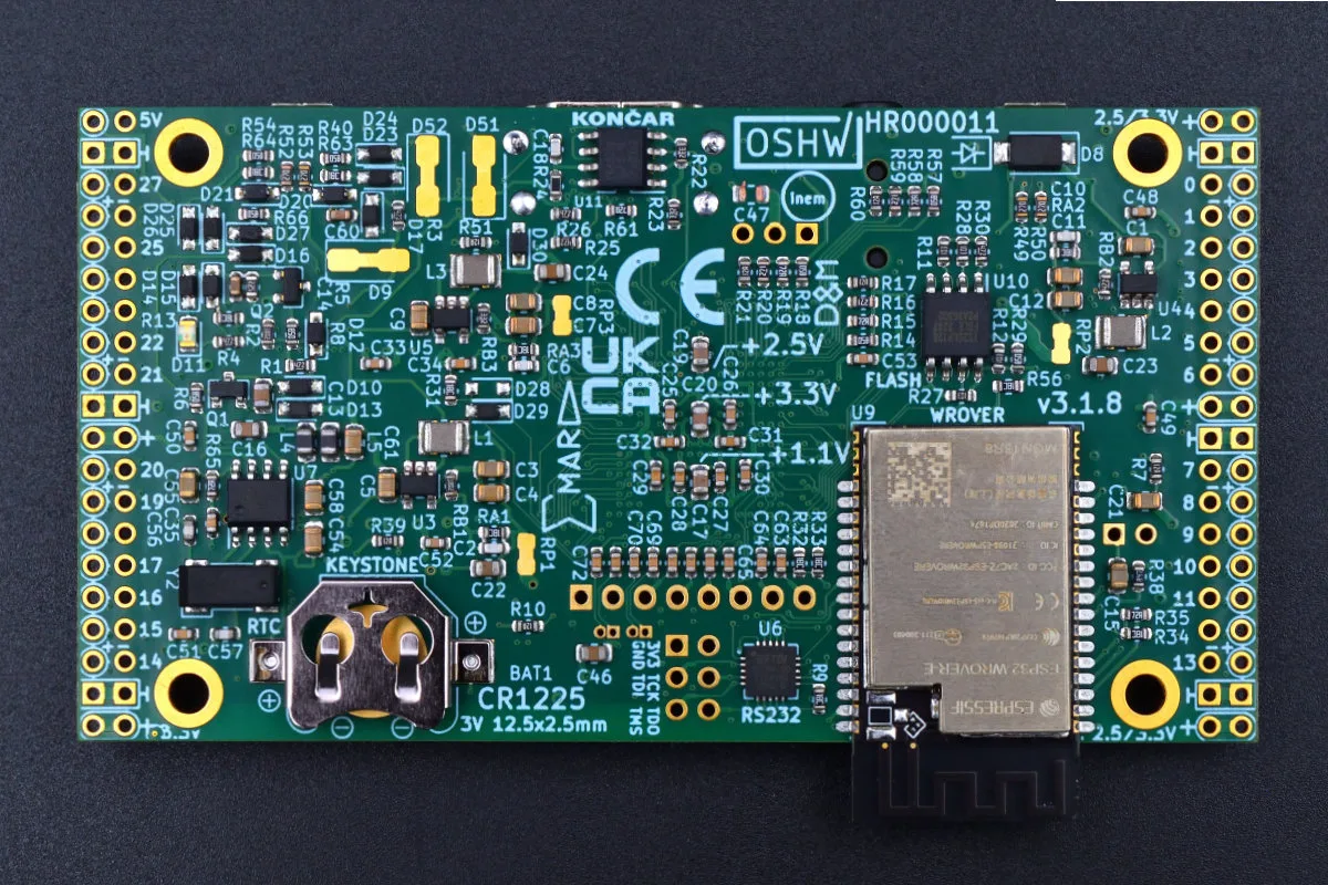 Na poleđini je i ležište za CR1225 bateriju ugrađenog MCP7940N RTC-a. Sada je i trenutak da pomenemo i 56 pinova (28 „PMOD-friendly“ differencijalnih parova) za mejkersku upotrebu sa signalima. Pinovi su svi 3.3 V, a pinovi od 0 do 13 mogu da se prebace i u 2.5 V mod. Od napojnih kontakata u okviru ova dva niza rupa nalaze se i oni sa 5 VDC, 3.3 VDC, ali i GND pinovi.