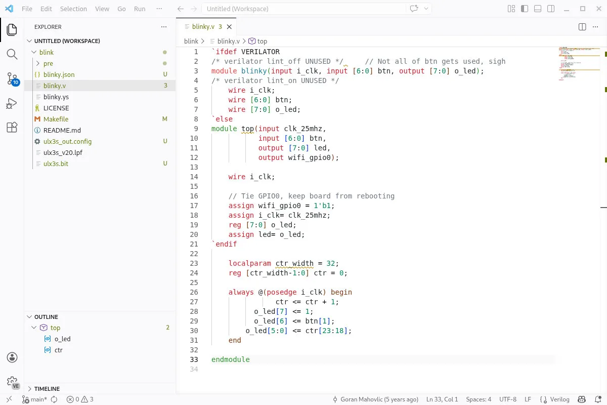 Najzad instaliramo Verilator (sudo apt-get install verilator) i pozicioniramo se u direktorijum blinky. Pre nastavka u Makefile-u uskladimo broj ćelija sa našim modelom na 12F i trima komandama kompajliramo i flešujemo kod na FPGA.