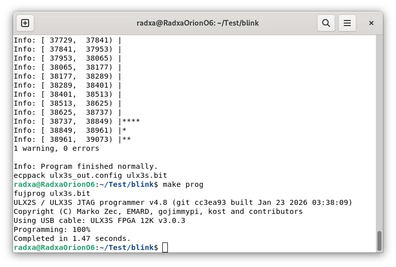 radxa@RadxaOrionO6:~/Test/blink$ fujprog blink_12f.bit