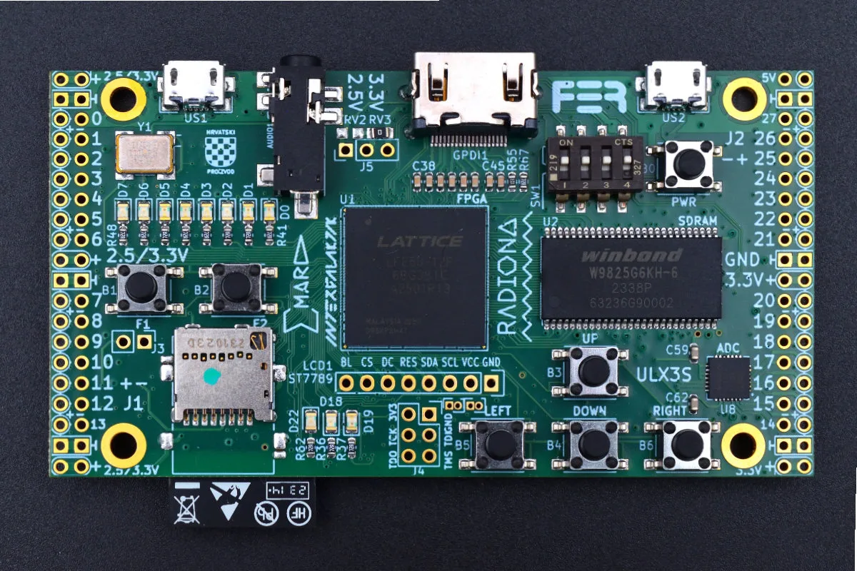 Radiona ULX3S je divan FPGA razvojni sistem, STEM učilo, pa i DIY retro-gaming konzola bazirana na odličnom Lattice LFE5U-12F čip ECP5 FPGA serije. Model sa najmanje ćelija, ali sasvim dovoljno za veoma složene projekte, a kamoli za početničko upoznavanje i prve FPGA projekte sa 12.000 ćelija može se nabaviti za oko 120 USD.