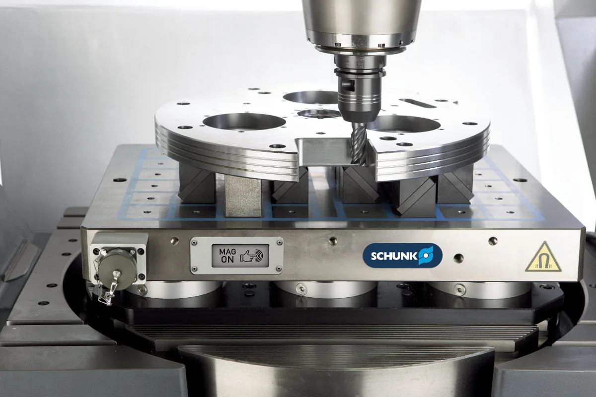 Stezanje radnih komada pomoću tehnologije magnetne stege nije samo impresivno i obezbeđuje veliku silu stezanja nego je takođe idealno rešenje stezanja za aplikacije glodanja s petostranom obradom radnog komada u jednom podešavanju. | photo: Schunk