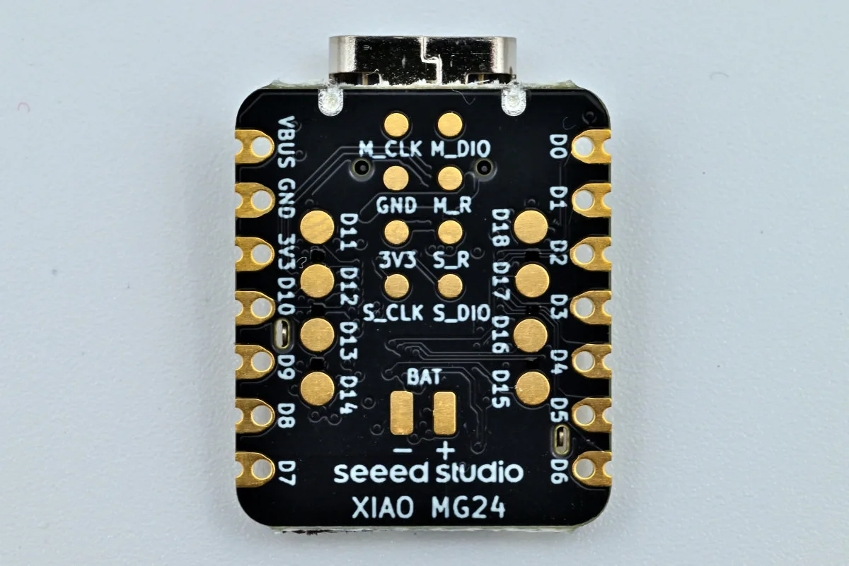 Sa naličja, kao i kod svih XIAO ploča nalaze se oznake za ivične konektore, kao i dodatne označene konekorske tačke. Ovde otkrivamo jedan interesantan detalj. Gornja grupa konektorskih tačaka: M_CLK, M_DIO i M_R su SWD (Serial Wire Debug interfejs za programiranje i dibag ARM Cortex-M mikrokontrolera) interfejs za MG24 – što je skraćena oznaka za silicon Labs EFR32MG24B220F1536IM48 mikrokontroler.