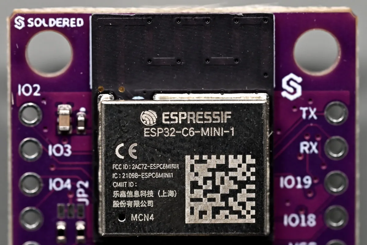 Espressif ESP32-C6-MINI-1-N4 modul je sa integrisanom antenom i direktno se lemi na odgovarajuću PCB ploču. U ovom slučaju, Soldered se odlučio za minimalizam i dizajnirao ploču dimenzija svega 25.33 x 25.33 mm. Ploča u svojim uglovima ima montažne rupe i lako se fiksira na željenom mestu. Izuzetno je laka, te neće predstavljati nikakvo opterećenje bez obzira na planiranu upotrebu. Oznaka N u imenu modula govori da je predviđen za rad u normalnom temperaturnom opsegu: –40 do 85 °C.