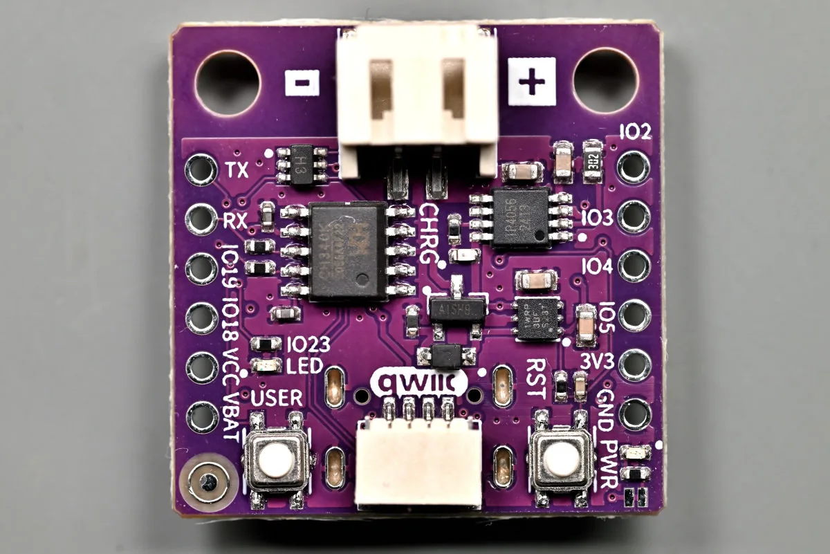 Ako pogledamo poleđinu ploče, pored pomenutog baterijskog konektora, videćemo i dva dugmeta USER i PWR – imena sve govore, ali i jedan Qwiic konektor. SparkFun Qwiic Connect System je ogroman ekosistem I2C senzora u potpunosti kompatibilan sa Adafruit STEMMA QT identičnim sistemom periferija. Ovo vam pri dizajniranju sopstvenih rešenja daje „otvorene ruke“ da njima zagrabite jedan od mnoštva periferija iz ovog ekosistema i odmah je upotrebite. Sve ovi dodaci uvek imaju već napisane biblioteke, ako ništa onda bar za Arduino IDE. Ne dajte se zbuniti, ako budete čitali neke od ranijih naših recenzija Soldered ploča, recimo Dasduino Connect ili Dasduino Core recenzija, gde pominjemo easyC konektor. To je sve isto, samo sa drugim nadimkom. I2C interfejs radi u standardnom 100 kbit/s i fast 400 kbit/s modu.