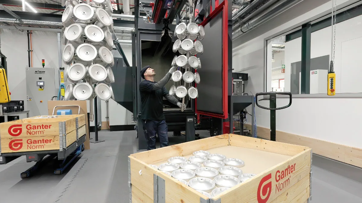 Odatle prolazimo pored logističkih i montažnih zona gde se manje serije i dalje sklapaju ručno, dok su velike porudžbine potpuno automatizovane. Poslednji korak proizvodnje je obrada površine: U velikom pogonu kompanije za premazivanje u prahu, površinski premazi se nanose prema specifikacijama kupaca. Iako je tehnički moguć širok spektar boja, crna ostaje daleko najpopularnija boja. Ona daje mnogim komponentama njihov prepoznatljiv izgled pre nego što se pakuju i isporučuju.