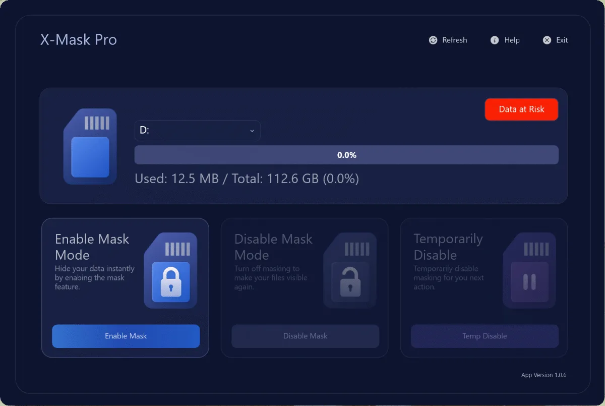 Fabrički, microSD je u normalnom modu rada, u kome se ponaša kao i svaka druga microSD kartica. Pristup podacima je neograničen i dozvoljen svima koji ga u rukama imaju. Dovoljno ga je ubaciti u bilo koji čitač kartica i koristiti kao skladište podataka. Ako pokrenemo X-MASK Pro Utility Tool kada je kartica u računaru u ovom modu, jasno će nam signalizirati da su podaci na disku u riziku.