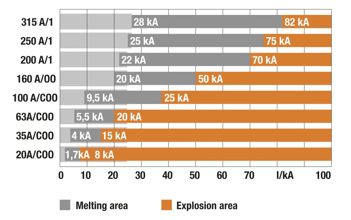 Prilikom dimenzionisanja osigurača, važno je koristiti maksimalni mogući rezervni backup osigurač. Grafik 1 jasno pokazuje da je nosivost struje groma malih osigurača ozbiljno ograničena. Samo dimenzionisanje prema maksimalnoj vrednosti nudi zaštitu sistema pomoću SPD-a bez ograničenja!