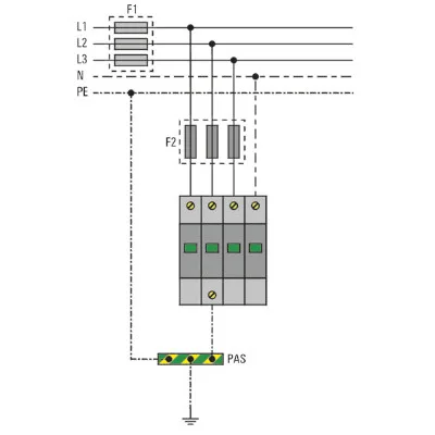 - Dodatni osigurač F2 je potreban ako je nominalna vrednost osigurača F1 na strani sistema veća od maksimalne snage osigurača, koju je naveo proizvođač SPD-a.